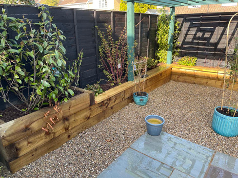 New raised railway sleeper flower beds were installed. These were filled with premium topsoil.